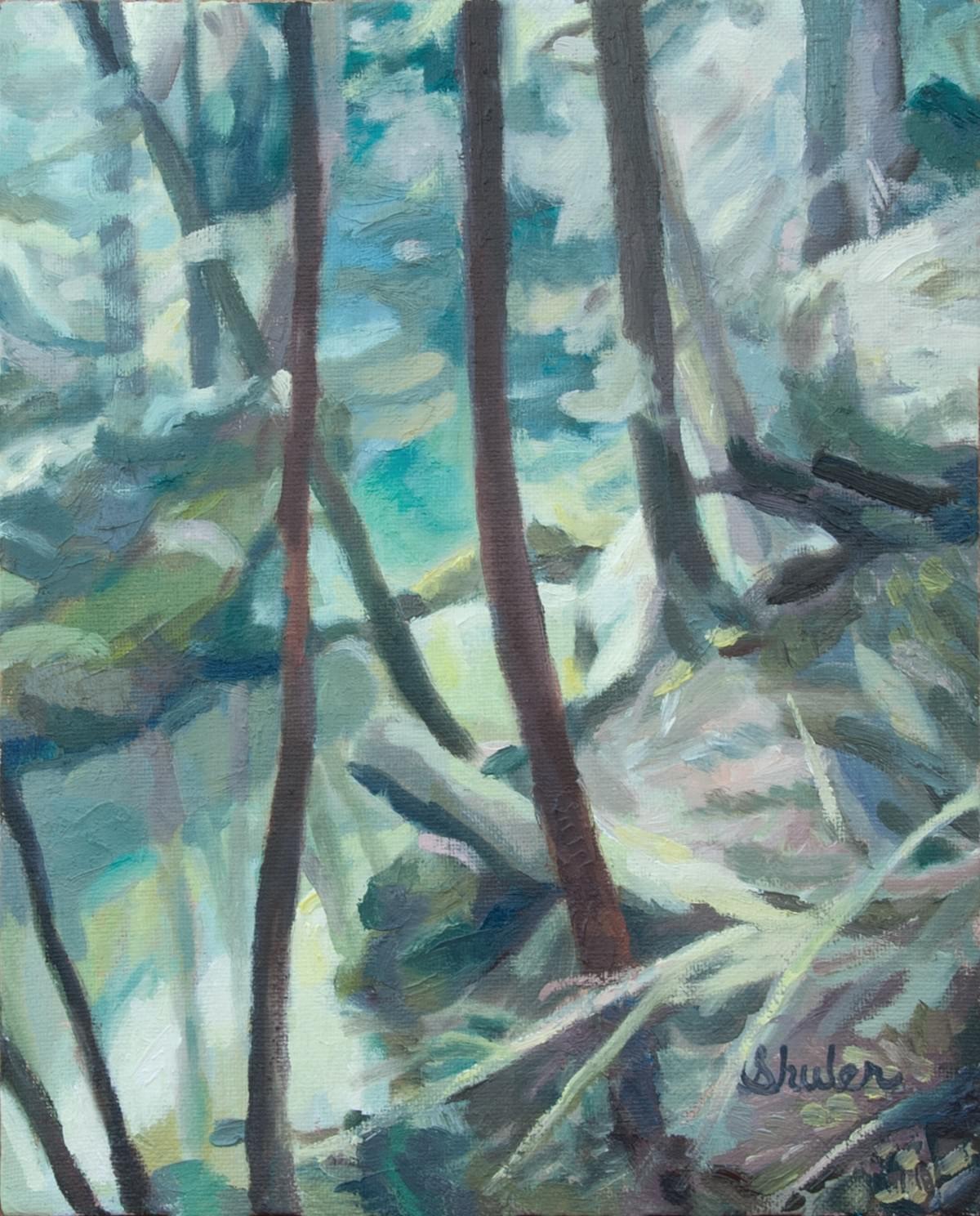 Filtered light creates airy tones within a wooded landscape in motion, as shifting trees and water blend into a tranquil, dreamlike space.