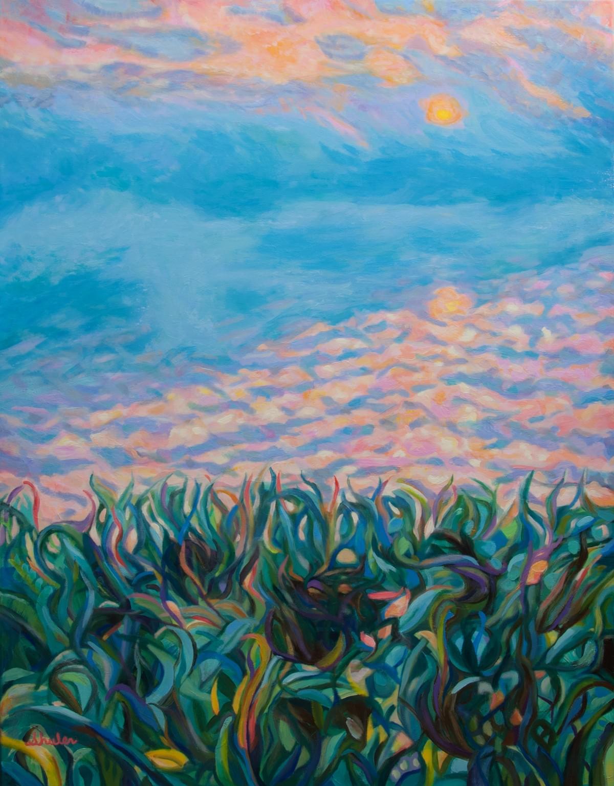 Daybreak captures the quiet lift of morning as cool blues give way to warm, rising light. Layered grasses and drifting clouds shimmer with movement, evoking renewal, calm, and the promise of a new day.