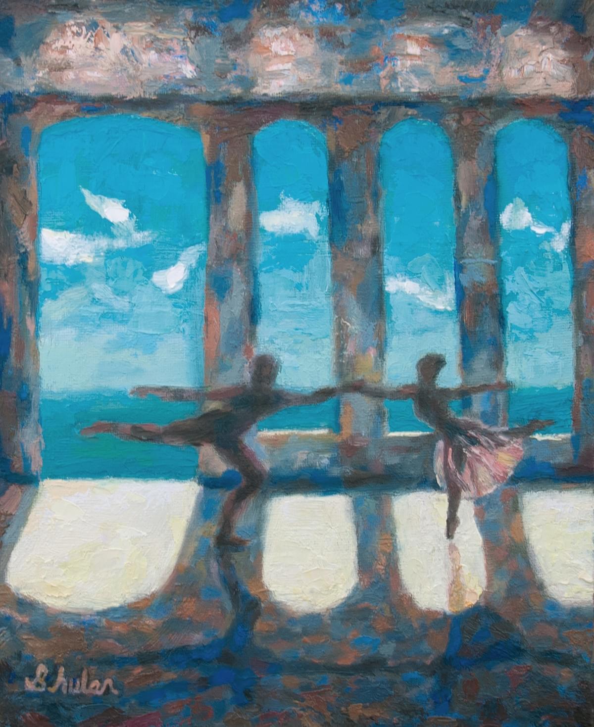 Softly rendered dancers move in unison as light pours through arched windows, blending architecture, motion, and coastal color into a dazzling moment.